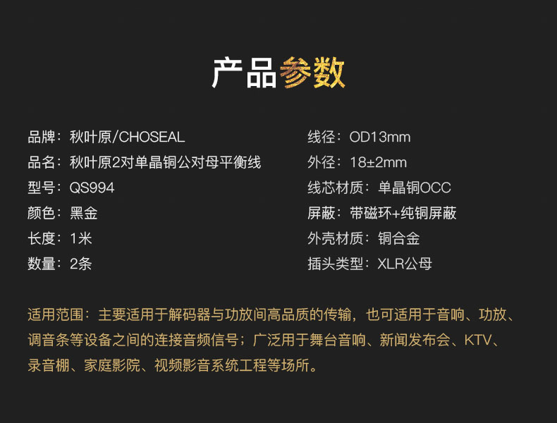 商品名称:秋叶原(CHOSEAL)QS994T1 数据线类 发烧级平衡线HIFI音响卡农线音频信号线 单晶铜系列音响设备连接线 1.0米