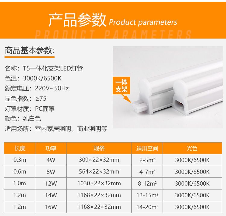 商品名称:佛山照明(FSL)T5 LED日光灯 灯管 T5支架一体化套装1米LED灯带12W日光色6500K 1只装