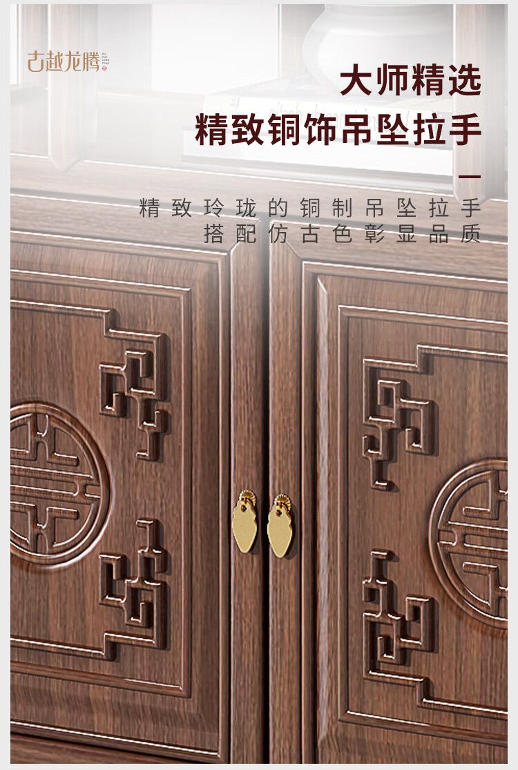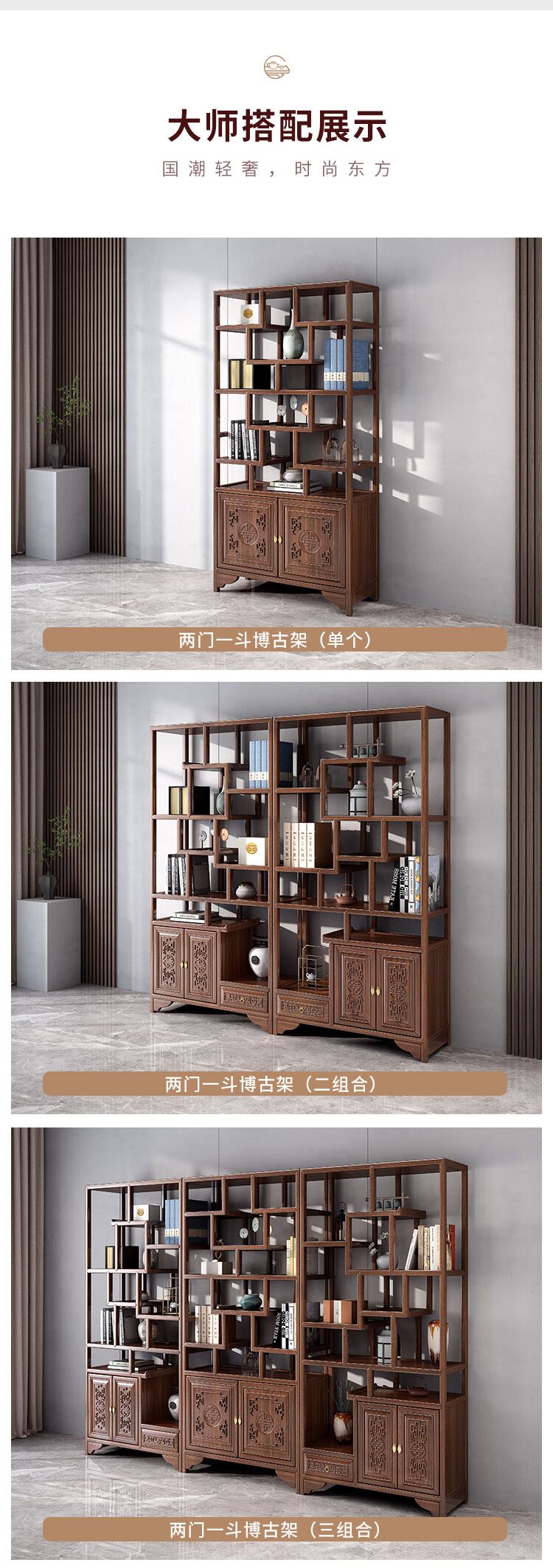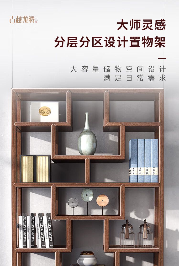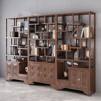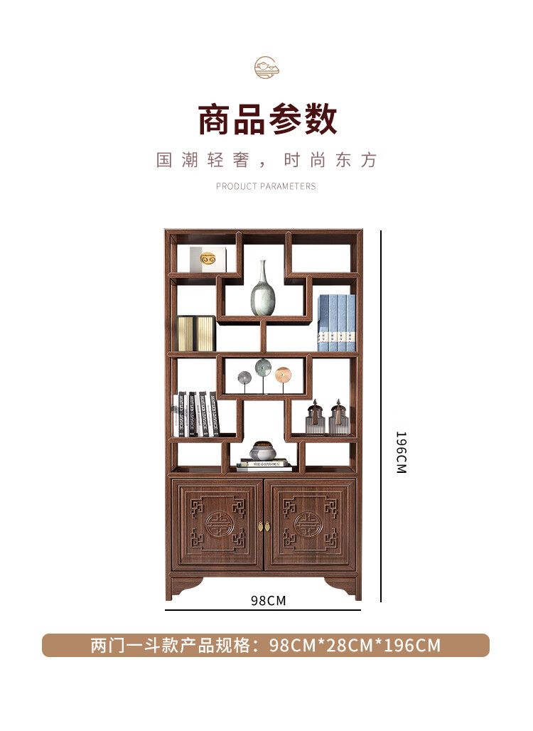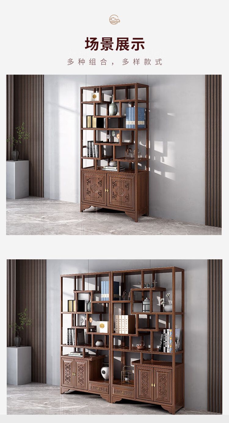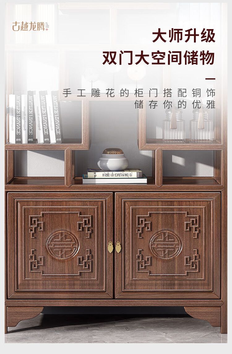 商品名称:古越龙腾 博古架实木新中式多宝阁茶叶柜茶具置物小型摆件隔断架客厅书架 两门一斗博古架三组合(胡桃色)