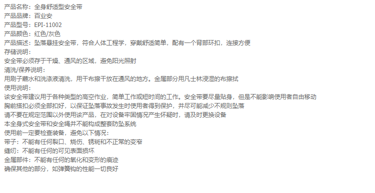 商品名称:百业安(BYA) EPI-11002 全身式安全带,全身舒适型安全带 红色 1条